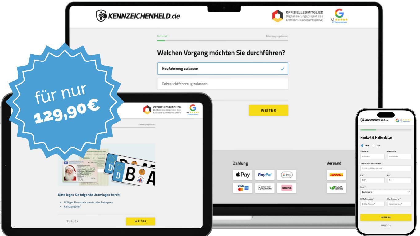 Nicht vergessen: Kfz-Kennzeichen – hast du schon eins? Dann halte es bereit. Wenn du ein Wunschkennzeichen möchtest, kannst du es ebenfalls online reservieren.